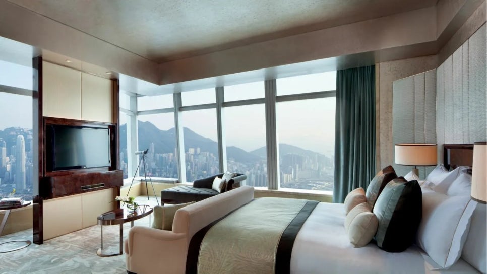 세계에서 가장 높은 층에 위치한 호텔. 118층짜리 초고층 빌딩인 ICC의 106~117/F층에 객실이 있어 현기증이 날 만큼 아찔한 전망을 자랑합니다. 객실에는 42인치 TV, 블루레이 플레이어 등의 최신 가전제품과 편의시설이 비치돼 있습니다. 최상층인 118/F층에는 수영장과 헬스클럽, 그리고 전망은 물론 환상적인 분위기를 자랑하는 바 Ozone이 있습니다. 보안이 철저해 객실을 출입하거나 엘리베이터를 이용할 때는 객실 키를 스캐너에 인식시켜야 합니다. 리셉션이 위치한 로비는 103/F층에 있습니다. 호텔 입구가 있는 도착 로비에서 전용 엘리베이터를 타면 리셉션까지 단 52초만에 올라갑니다.